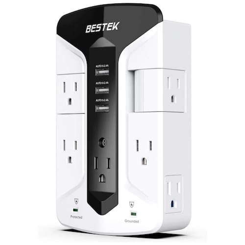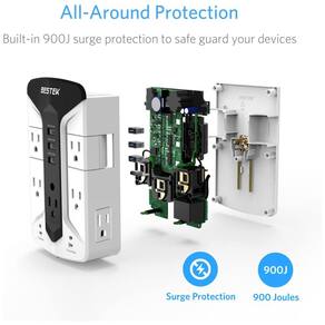 Este extensor de saída tem 7 saídas no total com capacidade de 1875W incluindo 2 saídas rotativas permite ângulos convenientes para conectar o equipamento sem interferir um com o outro e criar mais espaço para adaptadores grandes Integre com correspondência inteligente 3 0 2.4A, carregue todos os tipos de seus dispositivos com facilidade e rapidez. As 2 portas de correspondência inteligentes podem detectar automaticamente seus dispositivos e fornecer a eles a velocidade de carregamento mais eficiente e rápida Este protetor contra surtos de montagem na parede também oferece uma gama completa de proteção contra sobretensão, curto circuito e sobrecorrente. O invólucro retardante de fogo evita fogo aberto dentro de 750 Cenários Expandir O supressor de surto de montagem na parede de 900 joule protege os dispositivos contra raios e outros fatores de surto, especialmente adequado para PC, TV, geladeira, laptop, impressora, sistema de home theater, sistema de entretenimento Suporte de telefone na parte superior para melhor praticidade ao carregar seu smartphone LEDs protegidos e aterrados alertam o usuário sobre o status de funcionamento desta tomada USB Um parafuso para fixá lo estável na tomada de parede padrão Marca: Não Informado