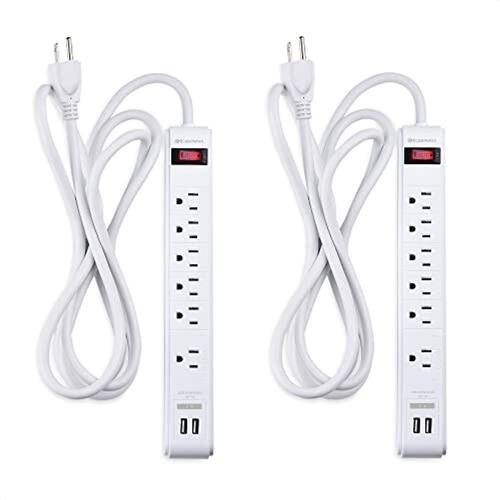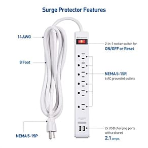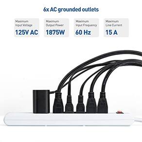 Conecte más con Cable Matters AC Potencia de productos 6 Salida Power Strip Transformar un enchufe eléctrico existente en una estación de mini-charging en la habitación recámara para cocina, oficina, o en la escuela. Dual USB Puertos de carga con una carga de dos 2,1 amperios compartida smartphones. El interruptor de encendido/apagado es apesível para una intégrant rápida o disjuntor de circuito Reset. Ele es montaje en pared o superficie con tiradores de rosca en la parte inferior de la surge protector. Puertos de carga USB Dual USB Puertos de carga con una 2,1 amperios compartida proporcionar con protección de picos de potencia para tus dispositivos electrónicos. Todos os dispositivos conectados estão protegidos con la supresión de sobretensiones de hasta 300 Julios. Especificaciones – Classificação Tetera: 15 A, 125 VAC, 60 Hz, 1875 W – julios Classificação: 300 – Sujeción Voltaje: 500 V – AC Potencia Longitud del cabo: 8 tortas Importantes notas Estimadas – sólo para uso en interiores en seco Ubicaciones – No exceda el índice de tetera Contenido del paquete 1 x 6-Outlet surge protector 1 x Plantilla de montaje en superficie Garantía Garantía limitada de un año y soporte producto