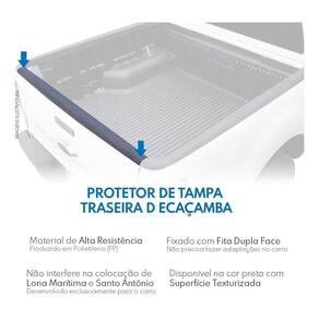 Especificações especificação técnica: - fabricado em polietileno pp - disponível na cor preta - fita dupla 3m - específico para o modelo do carro - garante proteção para a tampa traseira da caçamba do carro - encaixe sob medida. - fixação na tampa traseira da caçamba.