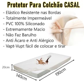 Protetor de colchão casal impermeável silicone + 2 fronha Neste kit conteúdo: 1 protetor casal com elastico cor bege. 2 fronha protetor de travesseiro O protetor para colchão siliconizado com elástico senior care, protege totalmente o colchão do suor, umidade e líquido, evita a proliferação de ácaros e fungos preservando o conforto e protegendo sua saúde. Ideal para incontinência urinária. Toque suave. Diferenciais: - não esquenta e não faz barulho; - antialérgico; - antiácaro; - lavável; - impermeável; - com elástico. Indicações - idosos - crianças - pne's portadores de necessidades especiais - incontinência urinária Tamanhos: Protetor casal 140 l x 190 c x 020 a cm Composição: confeccionado em plástico pvc 100% siliconizado com elástico de 14,5mm na borda, sistema vapt vupt . Fronha 70cm x 52cm. Composição: 100% pvc siliconado. com zipper lateral facilitando a colocação. cor: bege. Conteúdo: 1 protetor casal com elastico cor bege. 2 fronha protetor de travesseiro - o material é plástico Não, o material pela senior care na confecção do nosso modelo vapt vupt é o pvc siliconizado. - quando forrado por cima escorrega Depende muito do tecido, mas se for algodão não escorregará. - faz muito barulho Não, eles são confeccionados em pvc siliconizado além de dar um toque muito macio possibilita que o lençol seja extremamente silencioso. Marca: Não Informado
