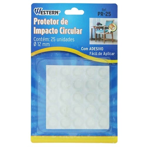 Protetor de impacto circular adesivo com 12mm de diâmetro. Kit com 25 unidades PR-25 Western. Para proteção de para janelas, portas, móveis, etc. - Marca: Western - Diâmetro: 12mm - Com adesivo - Fácil de aplicar - Protetor de impacto para janelas, portas, móveis, etc. - Com 25 unidades Marca: Não Informado