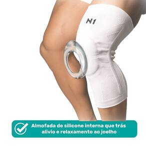 Vista a joelheira de forma que a almofada de silicone centralize sobre a patela, ajustando-a confortavelmente à anatomia da perna. Certifique-se de que não haja dobras ou compressão excessiva.