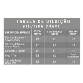 exemplo: quando colocamos diluição 1:2, significa dizer que é 1 parte de produto para 1 parte de água, totalizando 2 partes. Observação: diluir o produto com água limpa. Guardar a solução diluída por no máximo até 10 dias. Agitar bem a solução diluída antes do uso. Modo de uso: 1. Limpar bem a superfície. 2. Diluir o produto conforme a tabela indicativa. 3. Colocar a solução em um pulverizador. 4. Pulverizar na superfície e realizar acabamento com aplicador de espuma ou toalha de microfibra. Obs: diluir o produto com água limpa. Guardar a solução diluída por no máximo até 10 dias. Agitar bem a solução diluída antes do uso.