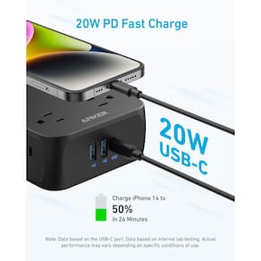 - Potência 11 em 1: possui 8 tomadas CA, 2 portas USB-A e 1 porta USB-C — o suficiente para manter uma sala inteira ligada.