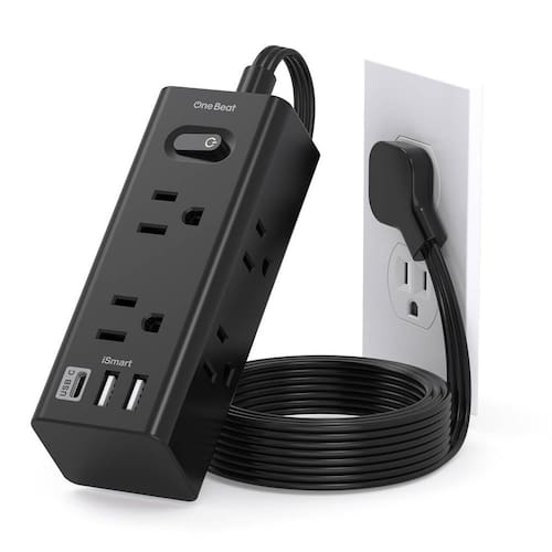 - ?Faixa de tomada ultra plana e cabo de extensão plano de 9,5 m?Com plugue ultrafino de apenas 0,9 cm e design de ângulo reto de 45 graus, um plugue de parede plana de perfil baixo é mais fino do que os plugues tradicionais, pode fechar facilmente One Beat parede e se esconder na parte de trás de móveis, cama ou geladeira, sem desperdício de tomada e espaço. Cabo de extensão de 90 cm com apenas 3 mm de espessura, feito de cobre puro, que tem melhor capacidade de carga de corrente (15A)