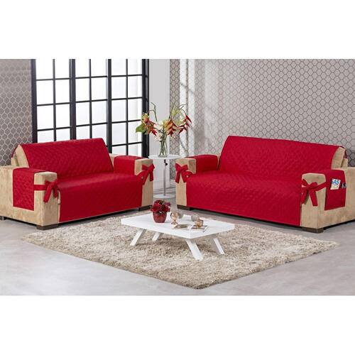 Protetor de sofá 2 e 3 lugares com laço e porta controle lateral vermelho Protetor de sofá 2 e 3 lugares face única com laço o kit capa para sofá é feito para diversos tipos de sofá, é ideal para você decorar a sua sala para que você receba sua visita em um ambiente mais bonito e agradável, além de proteger o seu sofá de manchas, sujeiras e outro tipo de dano que possa ser causado com o tempo. contém: 01 protetor de sofá para 2 lugares 1,90m x 1,10m.01 protetor de sofá para 3 lugares 1,90m x 1,50m.Medida dos 4 protetores para braço: 0,75cm x 0,48cm composição: tecido: 100% poliéster enchimento: 100% poliéster forro: tnt gramatura 20 detalhe do laço: todo matelado fabricação própria Ean: 7797111259979