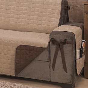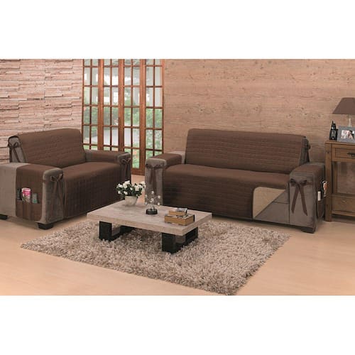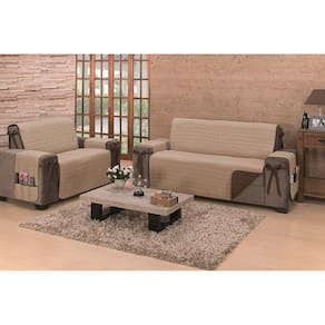 Protetor de Sofá Dupla Face Premium 2 e 3 lugares - Tabaco e Cáqui Confeccionado em Percal 150 fios e com acabamento em Viés, o protetor garante a durabilidade e o conforto do seu sofá. Possui 4 laços de fixação para melhor ajuste e porta objetos em um dos braços. Além disso, seu protetor é dois em um e pode ser colocado dos dois lados, para você mudar o visual do ambiente sempre que quiser. Contém: 1 Protetor para sofá de 3 lugares com medidas: Capa: 1,90m x 1,50m / Braços: 80cm x 40cm (porta objetos no braço direito) Medida total do produto: 3,05m x 1,90m 1 Protetor para sofá de 2 lugares com medidas: Capa: 1,90m x 1,10m / Braços: 80cm x 40cm (porta objetos no braço direito) Medida total do produto 2,70m x 1,90m Veste sofá com as seguintes medidas aproximadas: Protetor de 3 lugares: - Altura total do sofá: 97cm - Profundidade do assento: 55cm - Largura máxima do assento: 1,50m - Altura máxima do encosto: 70cm - Largura máxima do braço: 27cm - Altura do assento: 50cm - Largura total do sofá: 2,24m Protetor de 2 lugares: - Altura total do sofá: 97cm - Profundidade do assento: 55cm - Largura máxima do assento: 1,10m - Altura máxima do encosto: 70cm - Largura máxima do braço: 27cm - Altura do assento: 50cm - Largura total do sofá: 1,79m Composição: Tecido superior e inferior: Percal 150 fios 80% algodão/20% poliéster Enchimento: 100% poliéster - Acabamento em viés