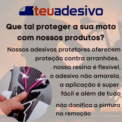 Valorize ainda mais sua moto com os Adesivos da TEU ADESIVO. Trabalhamos com uma produção de EXCELÊNCIA, com materiais de primeira linha garantindo pra você produtos de alta QUALIDADE. Fabricamos também adesivos personalizados para Motos, Carros, Decoração, Papel de parede, Sinalização entre outros.