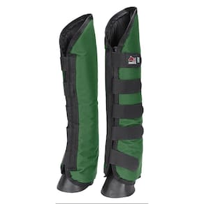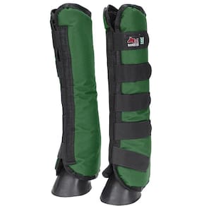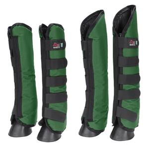 Protetor de viagem Mreis, utilizado para proteger o joelho / jarrete, canela, machinho, quartela e cascos durante o transporte. Fabricado em nylon cor Verde, com proteção interna de espuma e fechamento em tira autocolante. Jogo com 4 peças: 2 dianteiros e 2 traseiros.