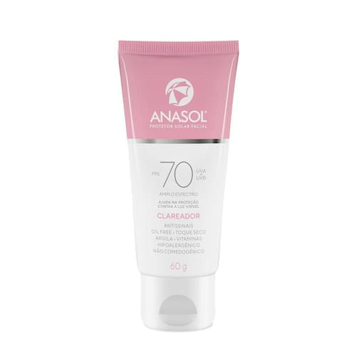 Anasol protetor solar facial clareador fps 70 60 g Excelente protetor para todos os tipos de peleContém argila orgânica que auxilia no controle da oleosidade e repõe minerais à pele, niacinamida que auxilia no clareamento e uniformização da pele. ClareadorDupla proteção uva/uvbVitamina e, aleo vera e pantenol com ação hidratante e antioxidante.Resistente à aguáEfeito matteAjuda da proteção contra luz visívelAmplo espectoToque secoCom argila orgânica Componentes e benefícios da argila orgânica: Para entender melhor as propriedades que elas possuem, primeiro é importante conhecer os componentes contidos nas argilas. São essas substâncias que conferem à argila tantos benefícios e que fazem dos diversos tipos de argila excelentes aliados nos tratamentos estéticos e na saúde. Os principais argilominerais que podem ser encontrados na composição química da argila são: Alumínio;Atua contra a falta de tonicidade, tem ação cicatrizante e inibe o desenvolvimento de staphylococcus aureus bactérias que podem provocar doenças, que vão desde simples infecções, como espinhas, furúnculos e celulites, até infecções graves, como pneumonia e meningite . Ferro;Tem papel importante na respiração celular e na transferência de elétrons. Na pele, as carências deste elemento manifestam-se por uma epiderme fina, seca e com falta de elasticidade Magnésio;Tem o poder de fixar os íons de potássio e do cálcio e de manter o gel celular, ou seja, ajuda na hidratação e na síntese das fibras do colágeno. Saiba mais na matéria magnésio: para que serve. Manganês;Tem ação específica na biossíntese do colágeno, anti-infecciosa, cicatrizante e antialérgica. Silício;Tem papel fundamental na reconstituição dos tecidos cutâneos e na defesa do tecido conjuntivo. Tem ação hemostática, purificante, adstringente e remineralizante. Na pele, proporciona hidratação, atua contra a flacidez cutânea e reduz as inflamações. Sódio e potássio;Ajudam a manter a hidratação e o equilíbrio iônico das células cutâneas.