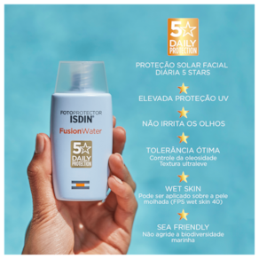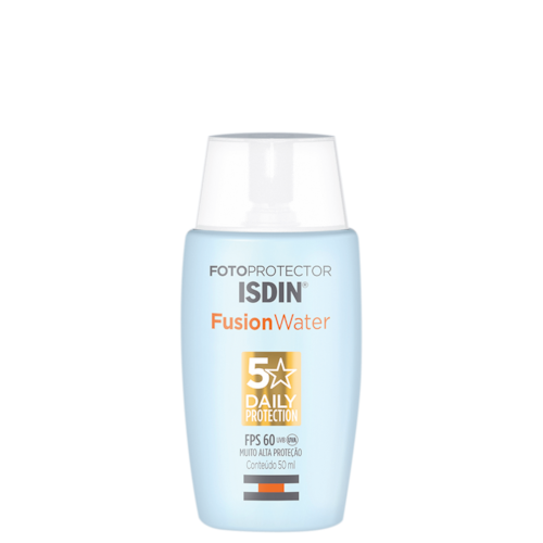 O Protetor Solar ISDIN Fusion Water 5 Stars FPS 60 tem textura leve, de rápida absorção, graças a sua fórmula livre de óleos. A ação do protetor ISDIN não deixa resíduos sobre a pele, é resistente à água e evita o ardor dos olhos. Tudo isso com uma sensação de frescor durante todo o uso.