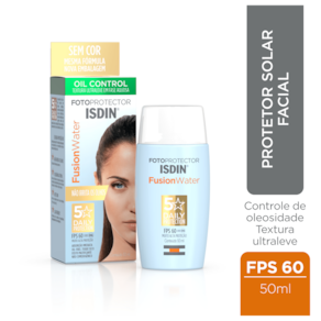 Protetor solar facial para todos os tipos de peles, especialmente oleosas. Protetor Solar ISDIN Fusion Water FPS 60 oferece alta proteção UVB/UVA ao rosto, além de controlar a oleosidade da pele e promover toque seco.