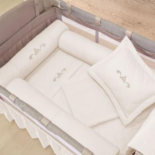 O kit protetor para berço desmontável possui 3 peças sendo 1 protetor de cabeceira e 2 protetores laterais. A cabeceira possui um lindo bordado que da um tom bastante elegante para seu berço. Possuem o formato de rolo com o tecido todo matelado.