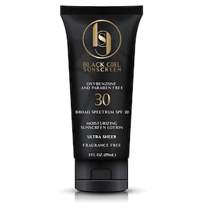 Loção hidratante de proteção solar para rosto e corpo. Infundido com jojoba e abacate. Resistente à água (80 minutos). Livre de oxibenzona e octinoxato. Ultratransparente. Sem resíduos brancos. Sem fragrância. Adeus guarda-chuva. www.blackgirlsunscreen.com. Feito nos EUA com ingredientes importados dos EUA.