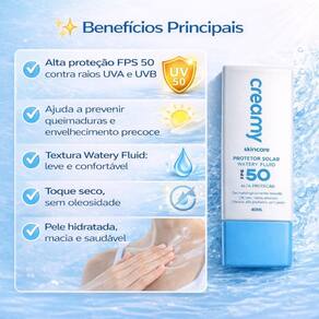 Este protetor solar é perfeito para todos os tipos de pele, especialmente as mais sensíveis, proporcionando uma barreira invisível contra os raios UVA e UVB. Além de proteger, ele hidrata e suaviza, deixando a pele com uma sensação aveludada e sem oleosidade. Invista na sua saúde e beleza com o Protetor Solar Creamy Watery Fluid Fps 50.