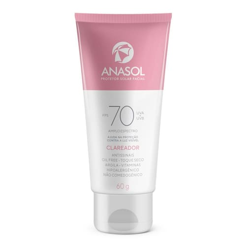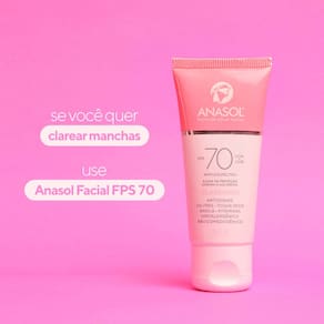 Protetor Solar Facial Anasol FPS 70 Clareador Antissinais Protetor solar facial de amplo espectro, desenvolvido para uso diário. Fórmula oil-free com potente ação clareadora de manchas, que previne e