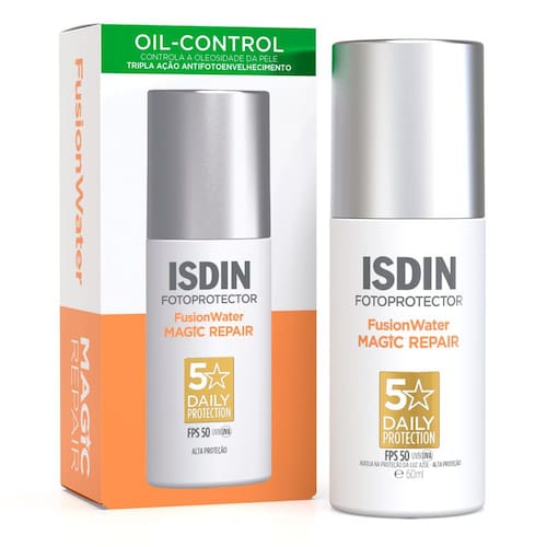 Protetor Solar Facial ISDIN Fusion Water Magic Repair 5 Stars FPS 50 ISDIN Fusion Water Magic Repair FPS 50 é um protetor solar facial em fase aquosa, com tripla ação contra o fotoenvelhecimento e açã