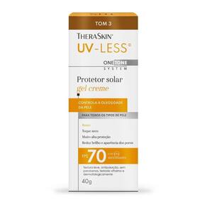 Protetor solar facial theraskin uv-less fps 70 gel creme tom Nome protetor solar facial theraskin uv-less fps 70 gel creme tom 3 40g Titulo protetor solar facial theraskin uv-less fps 70 gel creme tom 3 40g Marca theraskin Cor branco Familia-da-cor branco Tamanho 40 g Ingredient-list uva 30 Modelo protetor solar com cor Material loção Protetor solar facial theraskin uv-less fps 70 gel creme tom 3 40go que é e para que serve o protetor solar facial theraskin fps 70O protetor solar facial theraskin fps 70 é um produto desenvolvido para proteger a pele contra os efeitos nocivos da radiação solar uv. Sua fórmula avançada previne o fotoenvelhecimento, uniformiza o tom da pele e oferece um acabamento com toque seco. Com tecnologia one tone system, adapta-se a diferentes tonalidades de pele brasileira.Benefícios e diferenciais do protetor solar facial theraskin fps 70alta proteção solar com fps 70 e uva 30.Previne os sinais do fotoenvelhecimento da pele.Textura leve, de rápida absorção e acabamento seco.Resistente à água e ao suor.Tecnologia one tone system: uniformização do tom da pele com tons exclusivos para peles brasileiras.Como usar o protetor solar facial theraskin fps 70Aplicar abundantemente sobre a pele do rosto 15 minutos antes da exposição ao sol.Reaplicar sempre que necessário, especialmente após sudorese intensa, nadar ou secar-se com toalha. Marca: Não Informado