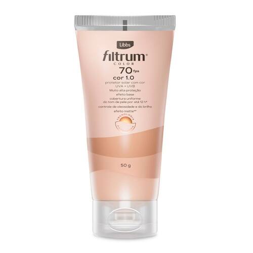 Filtrum Color FPS 70 Cor 1.0. Protetor solar com cor UVA + UVB. Muito alta proteção efeito base. Cobertura uniforme do tom de pele por até 12h. Controle de oleosidade e do brilho. Efeito Matte.