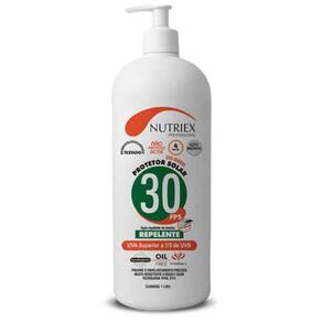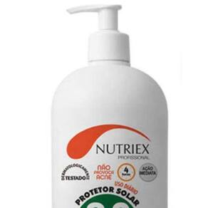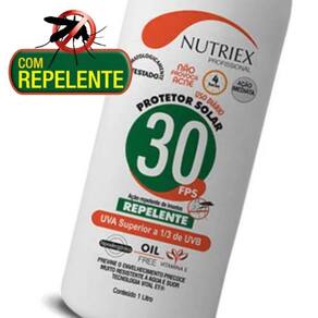 Protetor Solar FPS 30 1/3 UVA c/ Repelente 1lt NutriexProtetor Solar FPS 30 1/3 UVA 1lt NutriexProtetor solar UVA 1 litro (fps 30) - Ref: 0060996Conteúdo: Frasco 1 litro.Aspecto: Loção Cremosa.Cor: Branco a levemente amarelado.pH: 6,00 a 7,00.Densidade: 0,999 a 1,090 g/cm3.Oferece alta proteção à pele contra os efeitos nocivos da radiação solar, ajudando a prevenir as queimaduras solares. Com Tecnologia Bioactive Complex E®, complexo estável com fosfato de tocoferol biodisponível, com propriedades anti-oxidantes e anti-eritemas. AÇÃO HIDRATANTE, RÁPIDA ABSORÇÃO, TEXTURA LEVE. NÃO COMEDOGÊNICO. SEM CORANTE. Apresenta 2 horas de resistência à água e ao suor. Denominação de Categoria de Proteção (DCP): ALTA PROTEÇÃO.Características:- Composição isenta de ingredientes perigosos à saúde;- Eficaz contra as radiações UVA e UVB;- UVA superior a 1/3 de UVB;- Dermatologicamente testado, hipoalergênico, não comedogênico;- Previne o envelhecimento precoce;- Tecnologia Bioactive Complex E®, complexo estável com fosfato de tocoferol biodisponível, com propriedades anti-oxidantes e anti-eritemas;- 2 horas de resistência à água e suor;- 4 horas de duração em pele seca;- PABA free – isento deste filtro solar.Boas práticas de fabricação:A Nutriex possui o Certificado de Boas Práticas de Fabricação e Controle, emitido pelo Ministério da Saúde / ANVISA Agência Nacional de Vigilância Sanitária. Este documento comprova a responsabilidade que a empresa possui em fabricar produtos com máxima qualidade, envolvendo profissionais altamente capacitados, padronização de procedimentos, qualificação de fornecedores, condições de instalação, controle de qualidade e garantia total da qualidade. Quando solicitada, a empresa disponibiliza os laudos de análise, eficácia e segurança, bem como as publicações no Ministério da Saúde.Peso: 1.09Codigo: 72755Marca: NUTRIEX