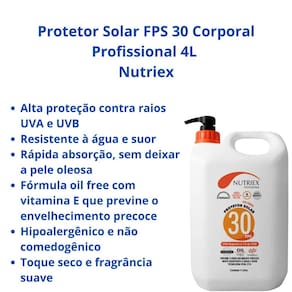 Adquira já o seu Protetor Solar FPS 30 Corporal 4 L Nutriex e mantenha sua pele protegida e hidratada durante toda a jornada!