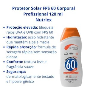 O Protetor Solar FPS 60 Corporal Nutriex oferece alta proteção contra raios UVA e UVB, possui rápida secagem, textura leve e aroma suave. Hipoalergênico, antioxidante e anti-eritemas, mantém a pele hidratada sem oleosidade ou ressecamento.