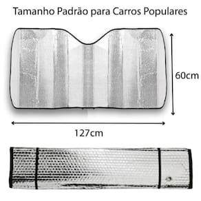 Material: Polietileno Dimensões: Comprimento Horizontal: 129cm x Comprimento Vertical: 60cm x Espessura: 3mm Peso: Aprox.: 85g Contém; 01 Protetor Solar Metálico Para-Brisas