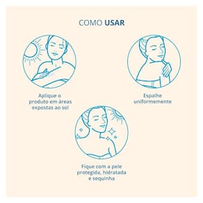 Aplique generosamente e uniformemente sobre a pele seca 15 minutos antes de se expor ao sol e sempre que necessário. Reaplique após nadar, secar-se com toalha, suor intenso ou tempo de exposição prolongado ao sol.