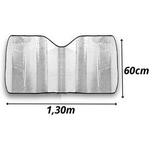 Dimensões do Protetor: 60 cm X 130 cm Composição: Estrutura protetora de alumínio polietileno, refletiva e super leve, com acabamento em viés preto costurado. Acompanhado de elástico para acomodar o protetor fechado dobrado. Possui também ventosa de silicone aderente. Conteúdo Da Embalagem: - 01 Protetor Solar Automotivo de Para-Brisas - 02 Ventosas de Silicone