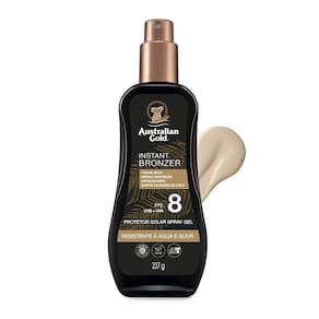 Protetor solar corporal em spray. Australian Gold Instant Bronzer FPS 8 oferece proteção contra os raios UVA e UVB e uniformiza o tom da pele.