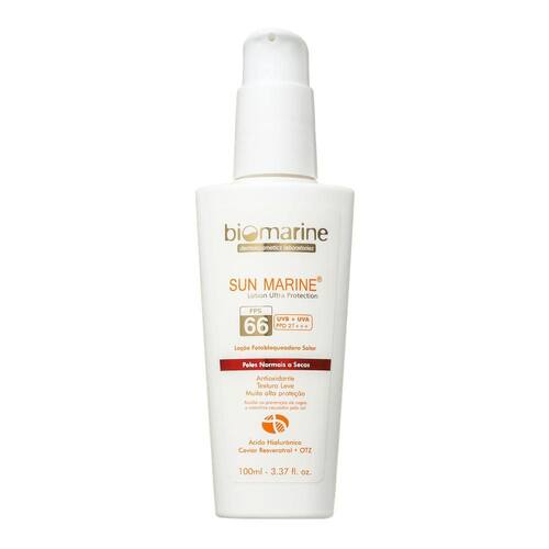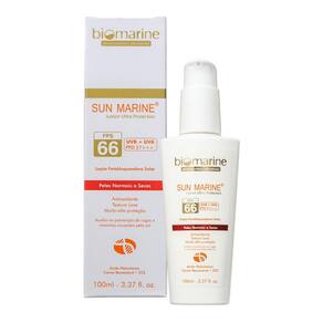 O Biomarine Sun Marine FPS 66 é um protetor solar de alta proteção desenvolvido para uso diário, com fórmula que combina filtros UVA e UVB e ativos antioxidantes e hidratantes. Sua textura leve e de rápida absorção proporciona toque seco e sensação de conforto, mantendo a pele protegida e com aspecto saudável.Benefícios e característicasAlta proteção contra os raios UVA e UVB, ação antioxidante, sensação de hidratação prolongada, textura confortável e rápida absorção, indicado para todos os tipos de pele.Ativos principaisMelitane, Caviar, Lanablue, Ácido Hialurônico, Resveratrol e OTZ.Modo de usoAplicar diariamente sobre a pele limpa e seca, espalhando de maneira uniforme até completa absorção. Reaplicar a cada duas horas ou sempre que necessário, principalmente após transpiração, contato com água ou fricção da pele.