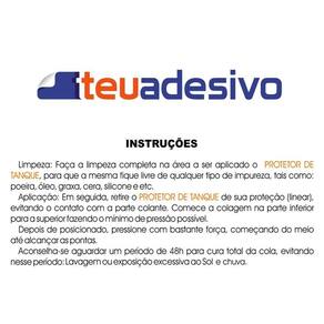 Limpeza: Primeiro faça uma limpeza completa na área a ser aplicado o adesivo, para que a mesma fique livre de qualquer tipo de impureza, tais como: poeira, óleo, graxa, cera, silicone e etc. Em seguida, retire o Protetor de Tanque de sua proteção (Liner) evitando o contato com a parte colante. MUITA ATENÇÃO na colocação, pois após a aplicação, se retirado perde parte de sua aderência e não é recomendado a reaplicação. Comece a colagem da parte inferior para a superior fazendo o mínimo de pressão possível. Depois de posicionado, pressione com bastante força, começando do meio até alcançar as pontas.