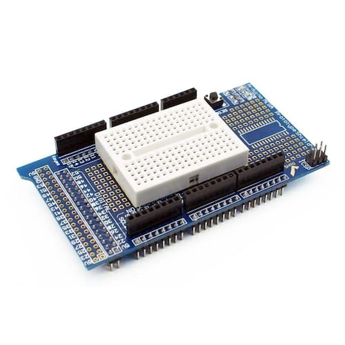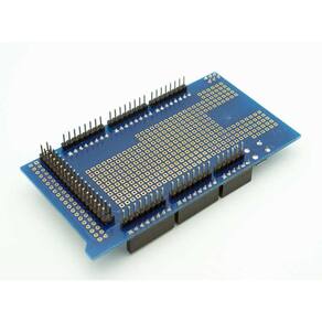 Este Protoshield foi desenvolvido para facilitar o processo de prototipagem, encaixando-se perfeitamente sobre a placa Arduino Mega, fornecendo ao usuário uma área de trabalho com 1 led de uso geral, 1 botão e todos os pinos referente ao Arduino Mega usados devido a disposição dos barramentos.