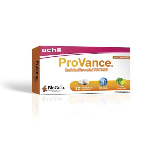 Probiótico em comprimido mastigável. Auxilia no funcionamento do intestino. Contribui para o equilíbrio da flora intestinal. Inibe o crescimento das bactérias nocivas ao organismo. Sabor agradável de limão.