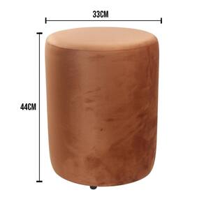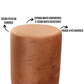 Com medidas de 44 cm de altura e 33 cm de diâmetro, esse pufe possui um peso de 2,85 kg. Sua espuma d28 tem 3 cm de espessura na parte superior e 1 cm nas laterais, proporcionando conforto ao sentar.
