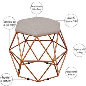 Descrição do produto: É fato que a decoração com itens aramados está super em alta, e é a responsável por mudar a decoração da casa! Esbanjando estilo, o Puff Six foge do tradicional e se destaca por sua modernidade e design de extremo bom gosto. Muito forte para o estilo de decoração glam ou também para áreas externas cobertas, este Puff Decorativo cai muito bem em ambientes como sala de estar, hall de entrada, recepções, ou onde mais sua imaginação permitir. Sua estrutura não desgasta no contato com o chão pois possui proteção com sapatas plásticas, além de um assento mega confortável. O seu mais novo queridinho do ambiente e cheio de charme Puff Six. :)