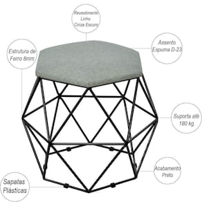 Descrição do produto: É fato que a decoração com itens aramados está super em alta, e é a responsável por mudar a decoração da casa! Esbanjando estilo, o Puff Six foge do tradicional e se destaca por sua modernidade e design de extremo bom gosto. Muito forte para o estilo de decoração glam ou também para áreas externas cobertas, este Puff Decorativo cai muito bem em ambientes como sala de estar, hall de entrada, recepções, ou onde mais sua imaginação permitir. Sua estrutura não desgasta no contato com o chão pois possui proteção com sapatas plásticas, além de um assento mega confortável. O seu mais novo queridinho do ambiente e cheio de charme Puff Six. :)