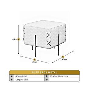 Verificar dimensões para acesso ao local de uso Ambiente Principal: Sala de Estar Cor: Caramelo Cor do Produto: Caramelo Escala de Brilho: Fosco Itens Inclusos: 1 Puff Linha ou Coleção: Eros Material da Estrutura: Madeira Eucalipto Material dos Pés: Metal Necessita Montagem: Não Peso: 9 kg Possui Baú: Não Possui Pés: 04 Possui Rodízio: Não Recomendações de Uso, Manutenção e Limpeza: Utilizar um pano levemente umedecido, seguido de pano seco.Evitar exposição ao sol, para que não sofra alterações na cor do tecido.Não limpar com escovas ou semelhantes. Suporta Até (kg): 120 kg