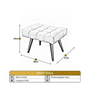 Verificar dimensões para acesso ao local de uso Ambiente Principal: Sala de Estar Complexidade da Montagem: Baixa: pode ser montado por uma pessoa sozinha Cor: Verde Cor do Produto: Verde Escala de Brilho: Fosco Itens Inclusos: 1 Puff Linha ou Coleção: Theo Material da Estrutura: Madeira Eucalipto Material dos Pés: Madeira Maciça Necessita Montagem: Sim Peso: 6 kg Possui Baú: Não Possui Pés: 04 Possui Rodízio: Não Recomendações de Uso, Manutenção e Limpeza: Utilizar um pano levemente umedecido, seguido de pano seco.Evitar exposição ao sol, para que não sofra alterações na cor do tecido.Não limpar com escovas ou semelhantes. Sistema de Montagem: Enroscar os pés na base Suporta Até (kg): 120 kg