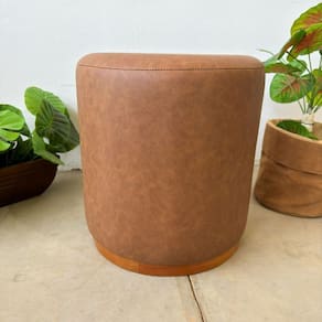 Puff Barcelona Decorativo com Couro Caramelo e Base Madeira