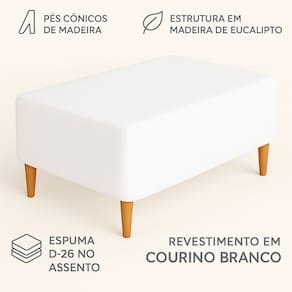 Fabricado com estrutura reforçada em madeira de eucalipto reflorestado, garante resistência e longa vida útil. O estofamento em espuma D26 proporciona conforto ideal para o dia a dia, enquanto o revestimento em couríssimo branco premium confere aparência luxuosa e facilidade na limpeza.