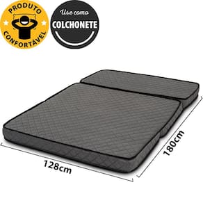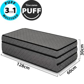 Características: - Enchimento: Espuma de Poliuretano Densidade 20 (D20) - 3 formas de uso: puff, sofá ou colchonete - Revestimento: Microfibra - Tamanho: Casal - Aberto: 180cm x 128cm x 10cm - Fechado: 128cm x 60cm x 30cm