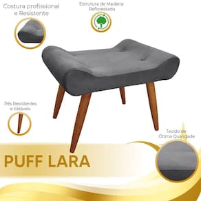 O Puff decorativo Lara e uma peca moderna, elegante e versatil, perfeita para adicionar conforto e estilo a qualquer ambiente. Sua durabilidade, design sofisticado e portabilidade o tornam uma escolha popular na decoracao contemporanea.