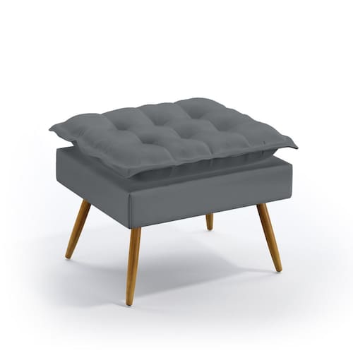 Características do Produto: Madeira de eucalipto proveniente de reflorestamento Fixação com grampos galvanizados Espuma Poliuretano D20 Produto costurado Tamanho: Único Possui pés: Sim Tipo de pés: Pés palitos de 25 cm Possui 4 pés palito de 25 cm Puff suporta até 90 Kg Embalagem: plástico bolha, papelão ondulado, malha, plástico Garantia de 3 meses contra defeitos de fábrica.