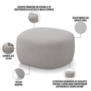 Características: Estrutura em madeira de eucalipto tratada e aparelhada com reforços, cantoneiras e chapas em MDF. Revestimento em tecido Bouclê de alta qualidade na cor Cinza. Assento composto por espuma D-26 e molas espirais. Percintas elásticas para maior resistência e durabilidade. Pés em madeira. Peso suportado: Até 120 kg.