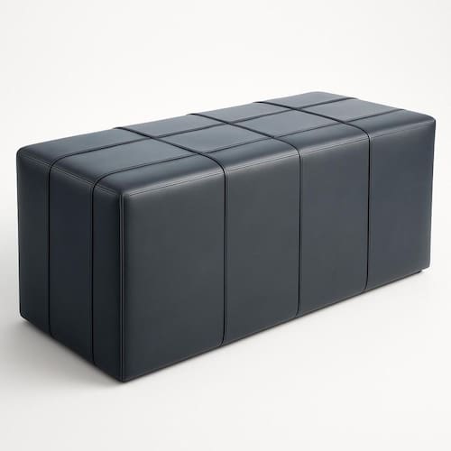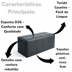 Sua estrutura é confeccionada em madeira de eucalipto reflorestada, garantindo não só durabilidade, mas também um toque sustentável. O revestimento em tecido sintético preto confere um acabamento luxuoso e moderno, enquanto os detalhes em costura rebatida evidenciam o cuidado com cada pormenor. Com dimensões ideais (50cm de altura, 130cm de comprimento e 45cm de profundidade), ele se adapta facilmente a diferentes espaços, seja como Puff na sala de estar, como recamier para cama casal 1.38, como assento calçadeira em closets, como banco para canto alemão ou mesmo como um charmoso banco em bares e pubs.