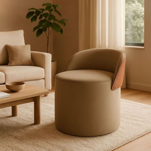 O encosto curvo proporciona apoio ergonômico e confortável, tornando o puff uma escolha inteligente tanto para decoração quanto para funcionalidade. Seu formato cilíndrico garante estabilidade e presença visual, sendo perfeito para compor quartos, closets, penteadeiras, salas de estar, halls de entrada, áreas comerciais e espaços de beleza.