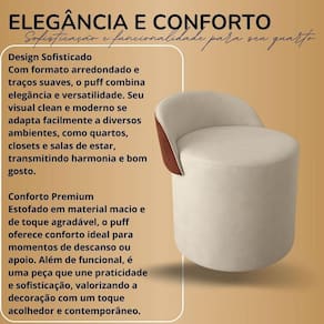 O encosto curvo proporciona apoio ergonômico e confortável, tornando o puff uma escolha inteligente tanto para decoração quanto para funcionalidade. Seu formato cilíndrico garante estabilidade e presença visual, sendo perfeito para compor quartos, closets, penteadeiras, salas de estar, halls de entrada, áreas comerciais e espaços de beleza.