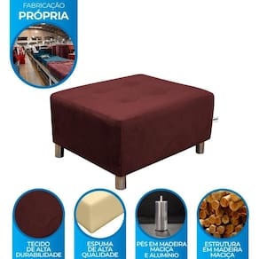 Produto: Puff Para Sala Nero | Tamanho (Cm): 35 x 50 x 60 | Altura do produto montado: 35 Cm | Largura do produto montado: 50 Cm | Profundidade do produto montado: 60 Cm | Peso do produto montado: 5 Kg | Largura do produto Embalado: 51 cm cm | Altura do produto Embalado: 26 Cm | Profundidade do produto Embalado: 3 meses | Peso com embalagem (cm): 6 Kg | Necessita montagem?: Sim, apenas rosquear os pés | Instruções/Cuidados: Evite com líquidos. Não expor a umidade. Não deixe o móvel exposto ao sol. Os acessórios também precisam de limpeza. | Possui pés?: Sim | Material dos pés: Madeira maciça revestido em alumínio | Material da estrutura: Madeira maciça em eucalípto de reflorestamento | Peso suportado: 80 Kg | Garantia: 3 meses | Conteúdo da embalagem: 1 Un Puff Nero | Estado de origem: Pr | Fabricante: Matrix | Vendido Por: Cor: Veludo Vinho Marinho