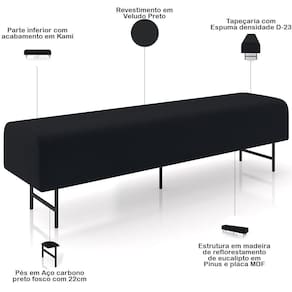 Puff Recamier Decorativo Com Pés Industrial 140cm Novara P05 Veludo Preto - Lyam Decor